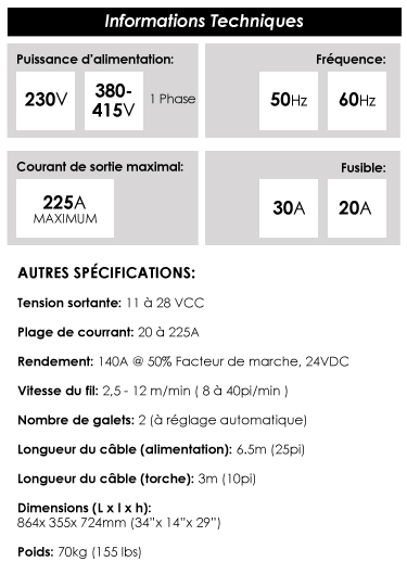 UltraMig 225HP permet à l'opérateur de choisir les options à l'aide d'une membrane tactile et de prendre le contrôle avec le simple bouton de la torche. La puissance et la vitesse du fil sont parfaitement synchronisées pour des soudures parfaites.